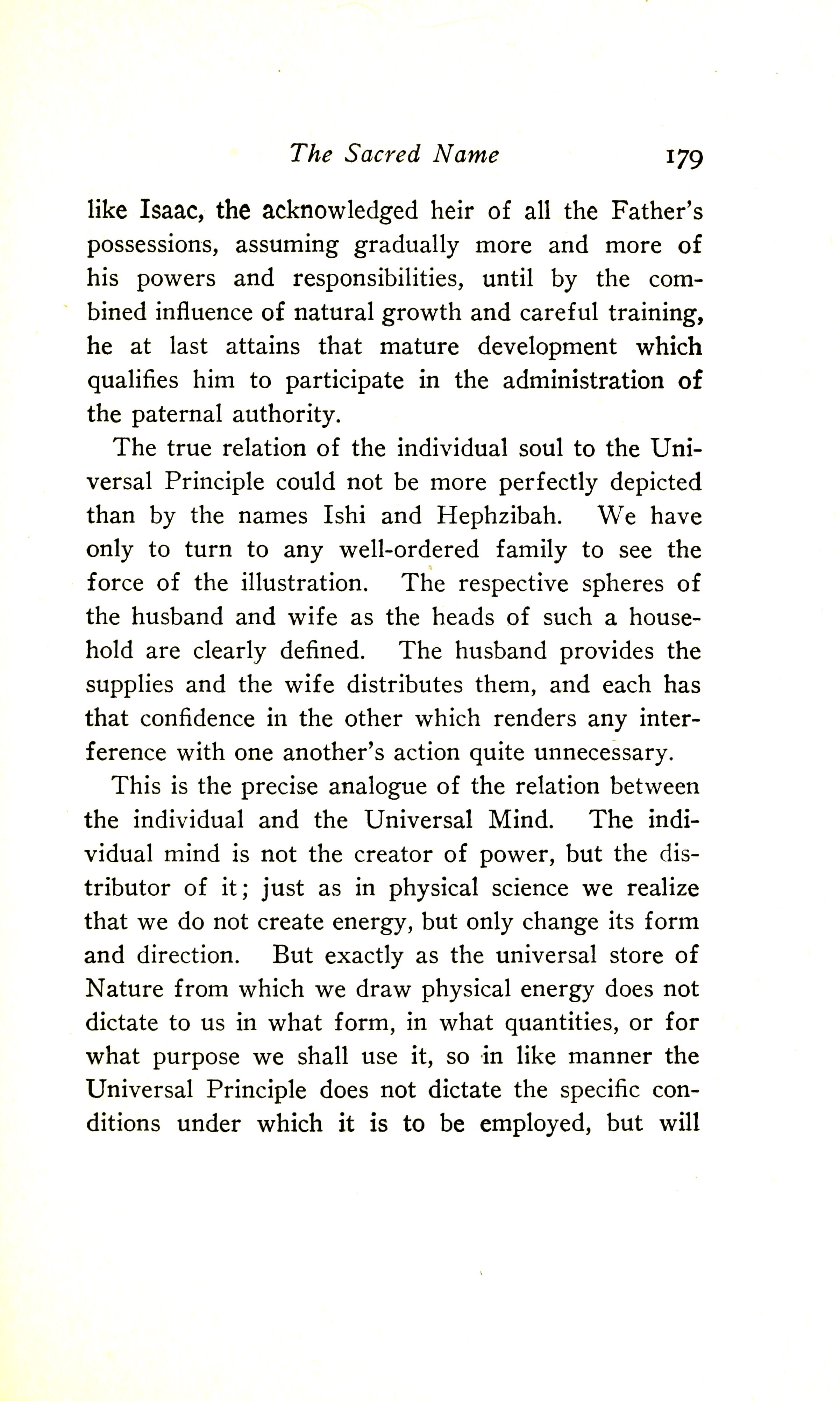 The true relation of the individual soul to the Universal Principle could not be more perfectly depicted than by the names Ishi and Hephzibah. We have only to turn to any well-ordered family to see the force of the illustration. The respective spheres of the husband and wife as the heads of such a household are clearly defined. The husband provides the supplies and the wife distributes them, and each has that confidence in the other which renders any interference with one another's action quite unnecessary.