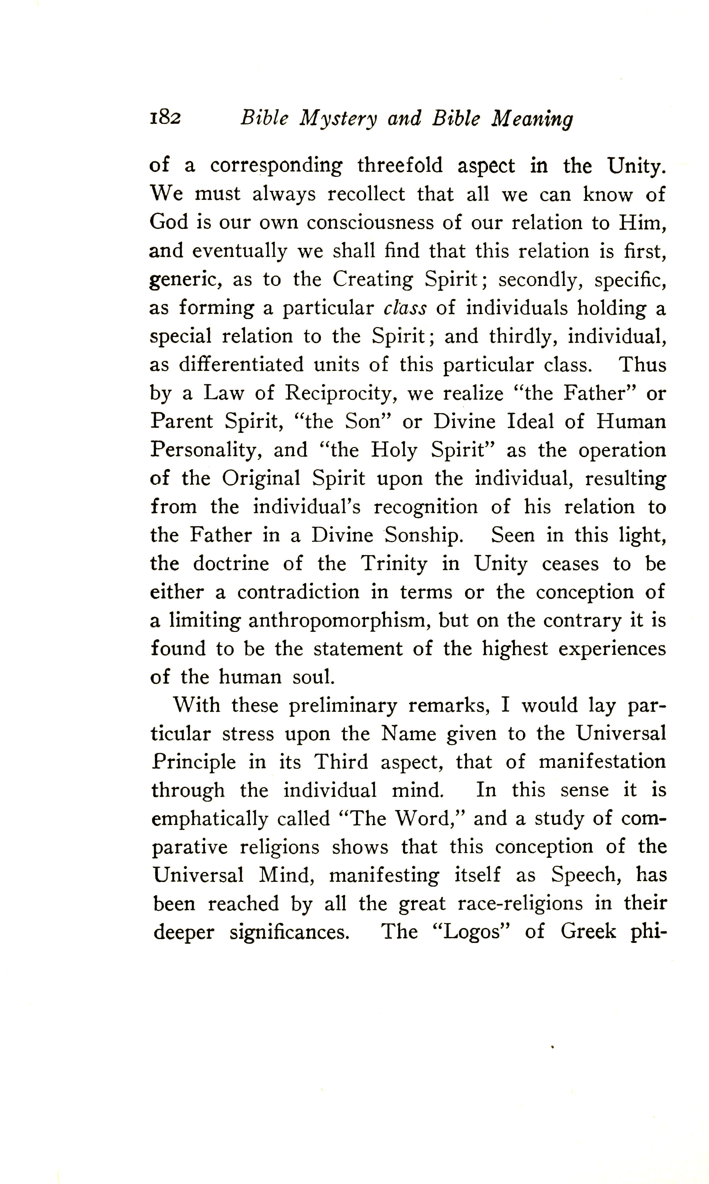 With these preliminary remarks, I would lay particular stress upon the Name given to the Universal Principle in its Third aspect, that of manifestation through the individual mind. In this sense it is emphatically called "The Word", and a study of comparative religions shows that this conception of the Universal Mind, manifesting Itself as Speech, has been reached by all the great race-religions in their deeper significances. The "Logos" of Greek