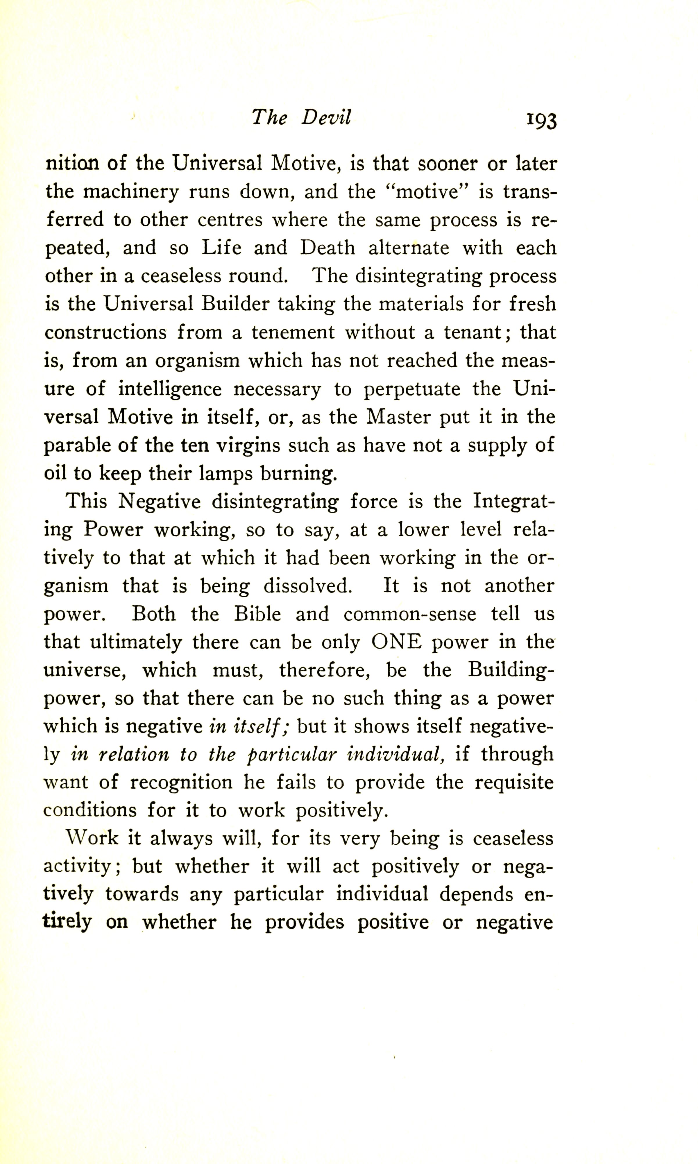 This Negative disintegrating force is the Integrating Power working, so to say, at a lower level relatively to that at which it had been working in the organism that is being dissolved. It is not another power. Both the Bible and common sense tell us that ultimately there can be only ONE power in the Universe which must, therefore, be the Building-power, so that there can be no such thing as a power which is negative in itself; but it shows itself negatively in relation to the particular individual, if through want of recognition he fails to provide the requisite conditions for it to work positively.