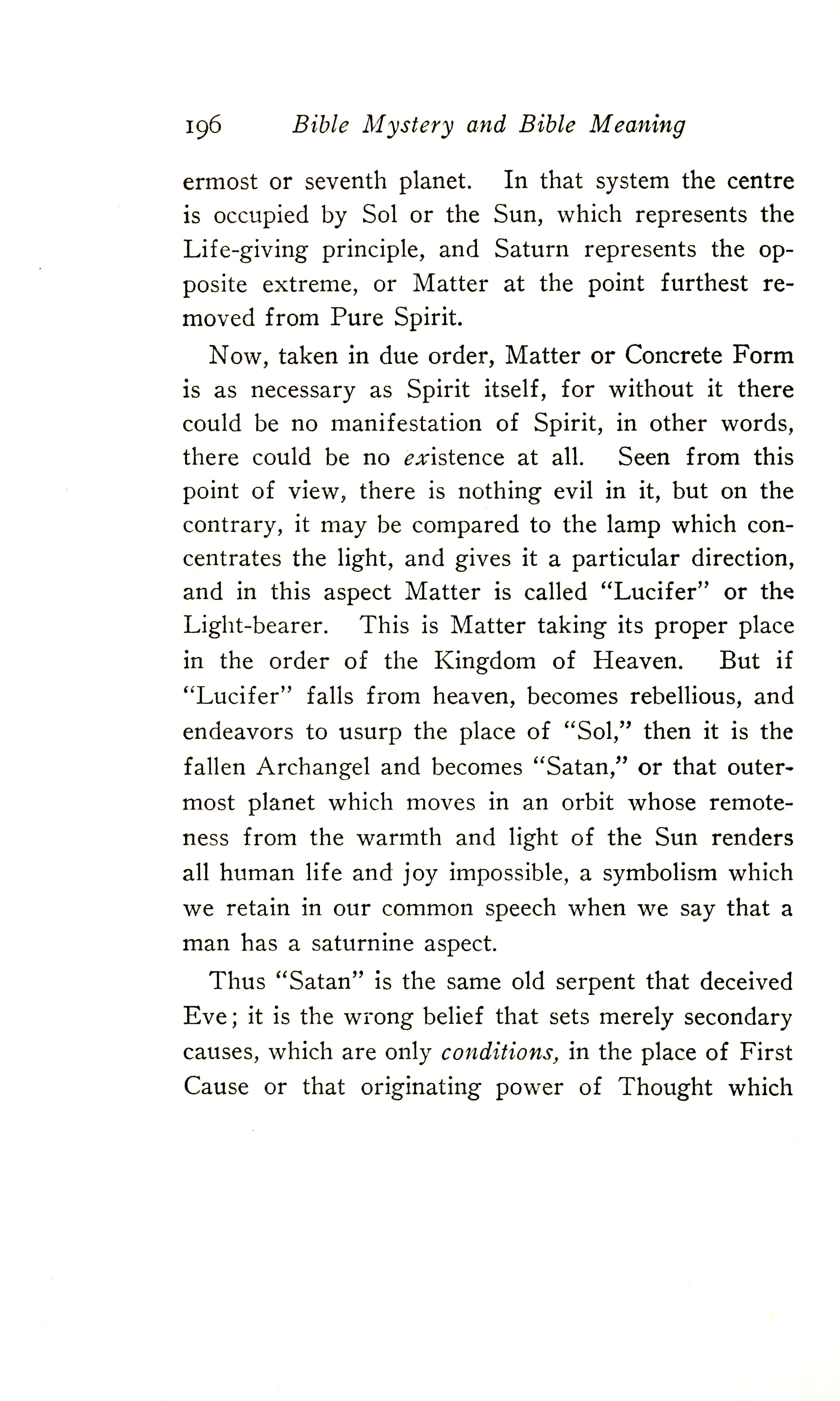 Now, taken in due order, Matter or Concrete Form is as necessary as Spirit itself, for without it there could be no manifestation of Spirit; in other words, there could be no existence at all. Seen from this point of view, there is nothing evil in it, but on the contrary, it may be compared to the lamp which concentrates the light and gives it a particular direction, and in this respects Matter is called "Lucifer" or the Light-bearer. This is Matter taking its proper place in the order of the Kingdom of Heaven. But if "Lucifer" falls from Heaven, becomes rebellious, and endeavours to usurp the place of "Sol", then it is the fallen Archangel and becomes "Satan", or that outermost planet which moves in an orbit whose remoteness from the warmth and light of the Sun renders all human life and joy impossible, a symbolism which we retain in our common speech when we say that a man has a saturnine aspect.