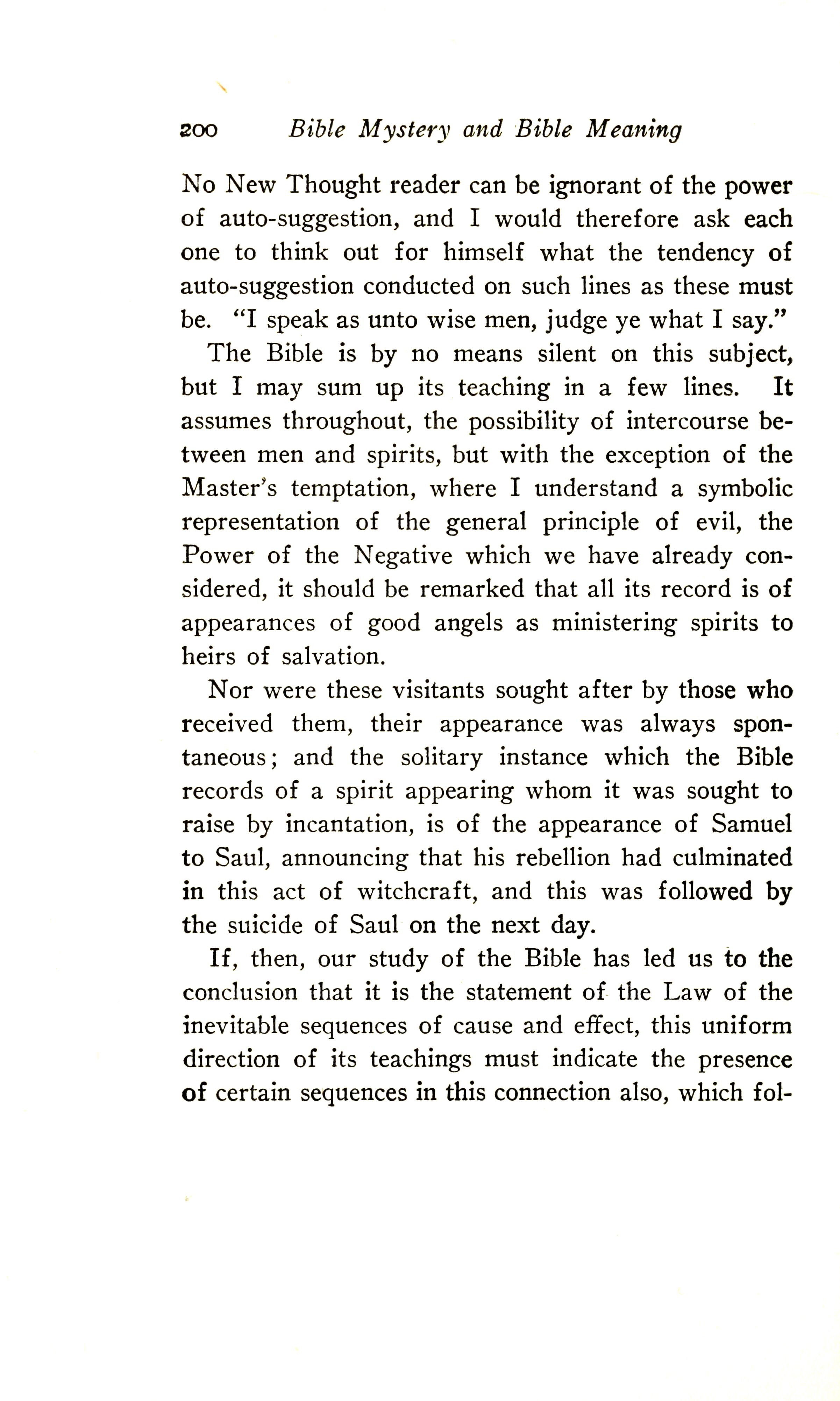 Nor were these visitants sought after by those who received them; their appearance was always spontaneous; and the solitary instance which the Bible records of a spirit appearing whom it was sought to raise by incantation is of the appearance of Samuel to Saul, announcing that his rebellion had culminated in this act of witchcraft, and this was followed by the suicide of Saul on the next day.
