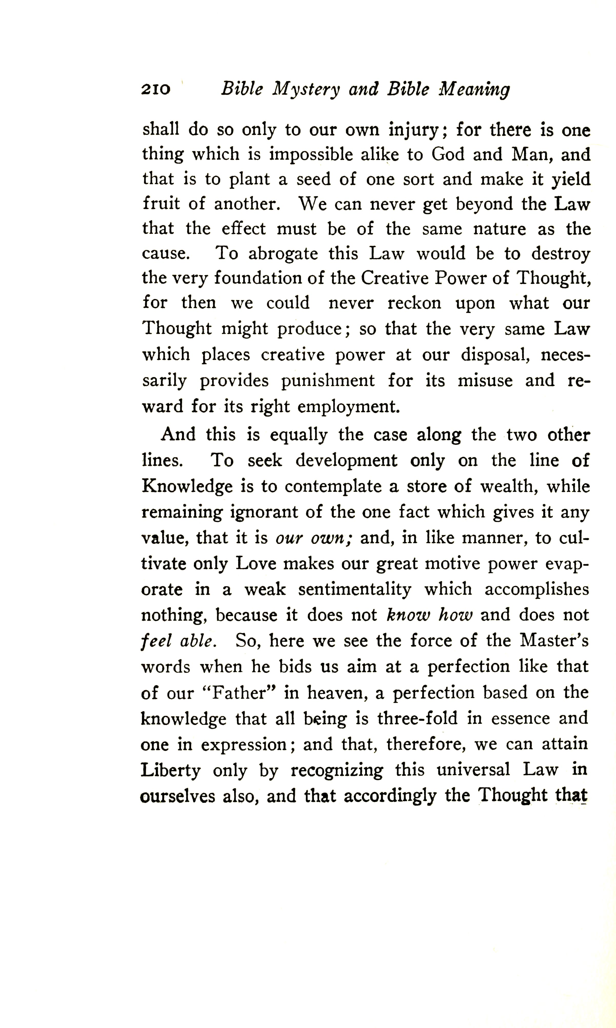 And this is equally the case along the two other lines. To seek development only on the line of Knowledge is to contemplate a store of wealth while remaining ignorant of the one fact which gives it any value: that it is our own; and, in like manner, to cultivate only Love makes our great motive power evaporate in a weak sentimentality which accomplishes nothing, because it does not know how and does not feel able. So here we see the force of the Master's words when he bids us aim at a perfection like that of our "Father" in heaven, a perfection based on the knowledge that all being is threefold in essence and one in expression; and that therefore we can attain Liberty only be recognising this universal Law in ourselves also; and that, accordingly, the Thought that