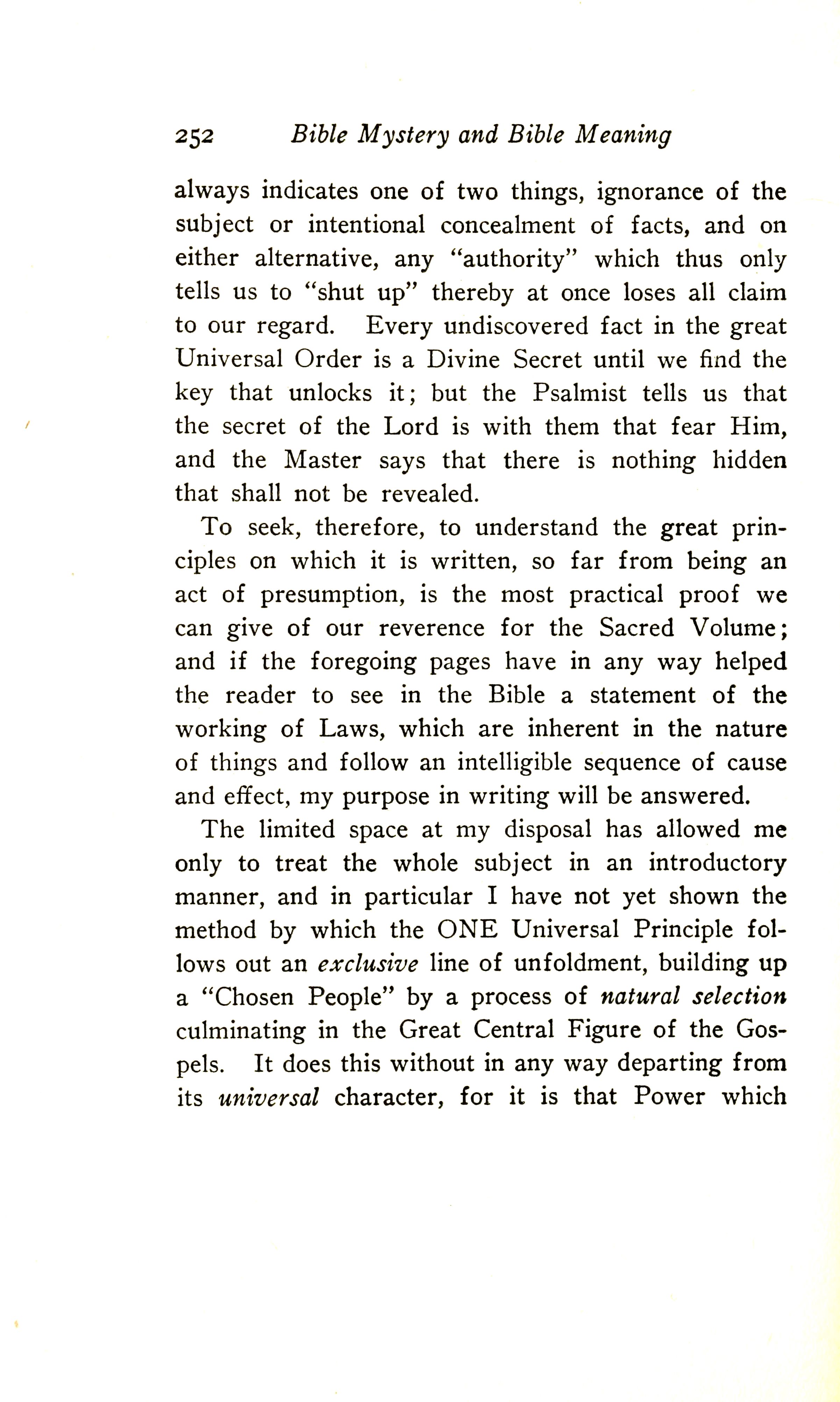 The limited space at my disposal has allowed me only to treat the whole subject in an introductory manner, and in particular I have not yet shown the method by which the ONE Universal Principle follows out an exclusive line of unfoldment, building up a "Chosen people" by a process of natural selection culminating in the Great Central Figure of the Gospels. It does this without in any way departing from its Universal character, for it is that Power which