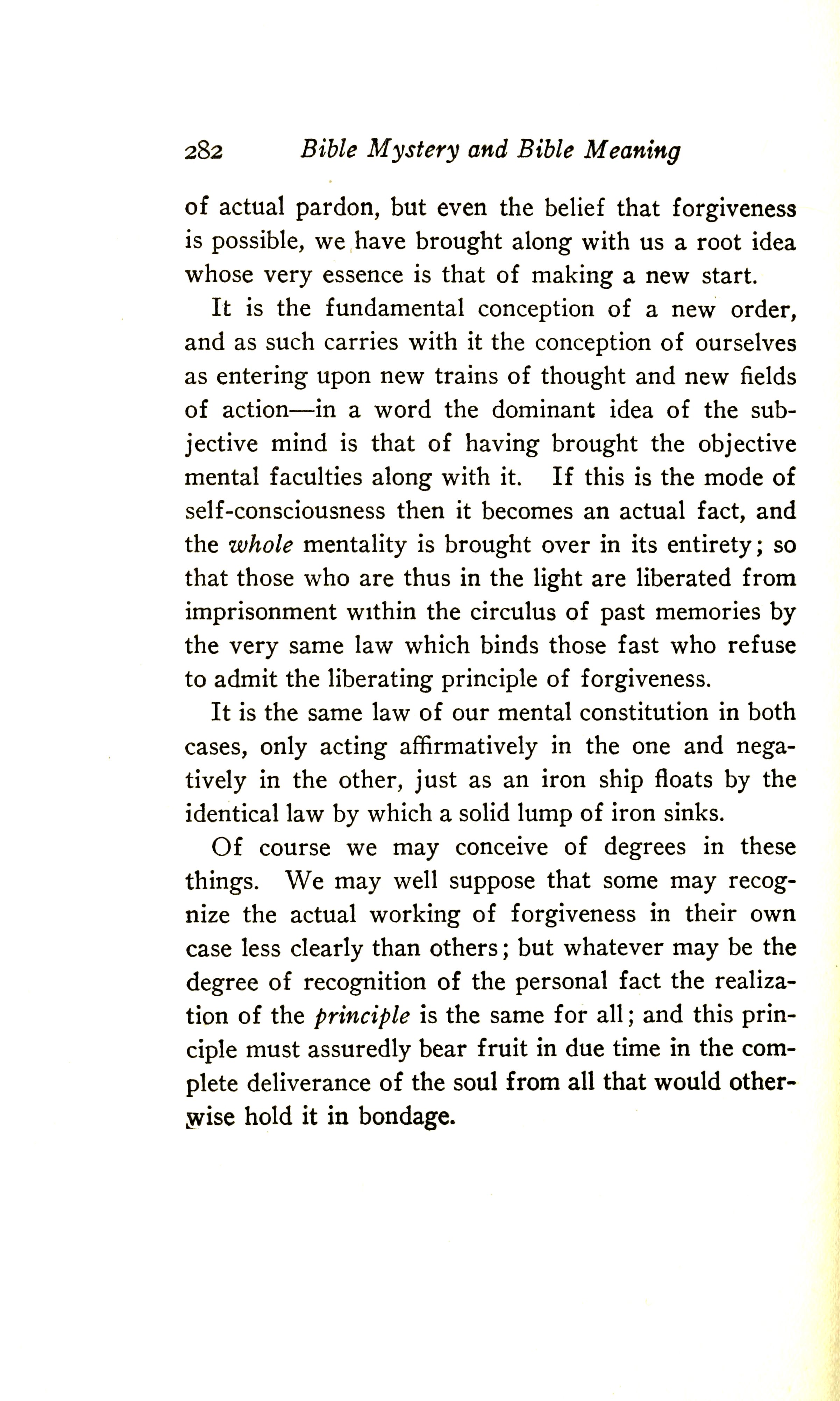 It is the fundamental conception of a new order and as such carries with it the conception of ourselves as entering upon new trains of thought and new fields of action --- in a word, the dominant idea of the subjective mind is that of having brought the objective mental faculties along with it. If this the mode of self-consciousness then it becomes an actual fact, and the whole mentality is brought over in its entirety; so that those who are thus in the light are liberated from imprisonment in the circulus of past memories by the very same law which binds those fast who refuse to admit the liberating principle of forgiveness. It is the same law of our mental constitution in both cases, only acting affirmatively in the one and negatively in the other, just as an iron ship floats by the identical law by which a solid lump or iron sinks.