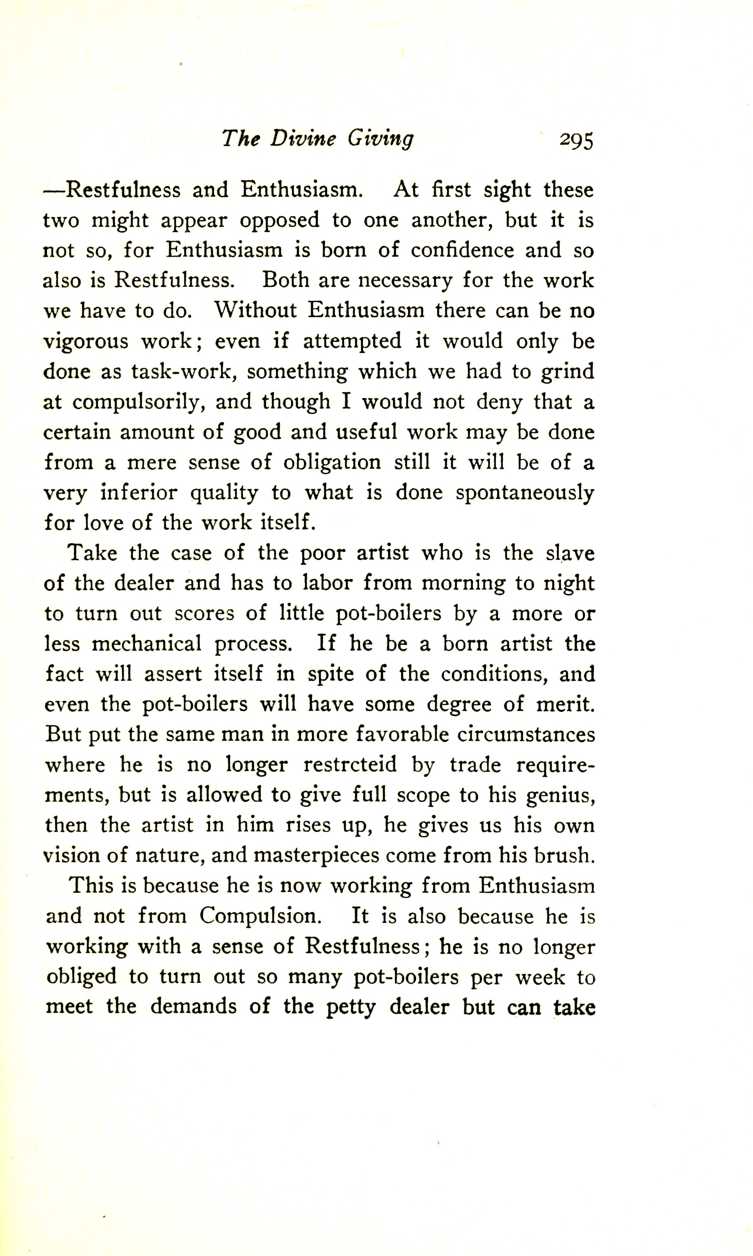 --- Restfulness and Enthusiasm. At first sight these two might appear opposed to one another: but it is not so, for Enthusiasm is born of confidence and so also is Restfulness. Both are necessary for the work we have to do. Without Enthusiasm there can be no vigorous work; even if attempted, it would only be done as task-work, something which we had to grind at compulsorily, and though I would not deny that a certain amount of good and useful work may be done from a mere sense of obligation, still it will be of a very inferior quality to what is done spontaneously for love of the work itself.