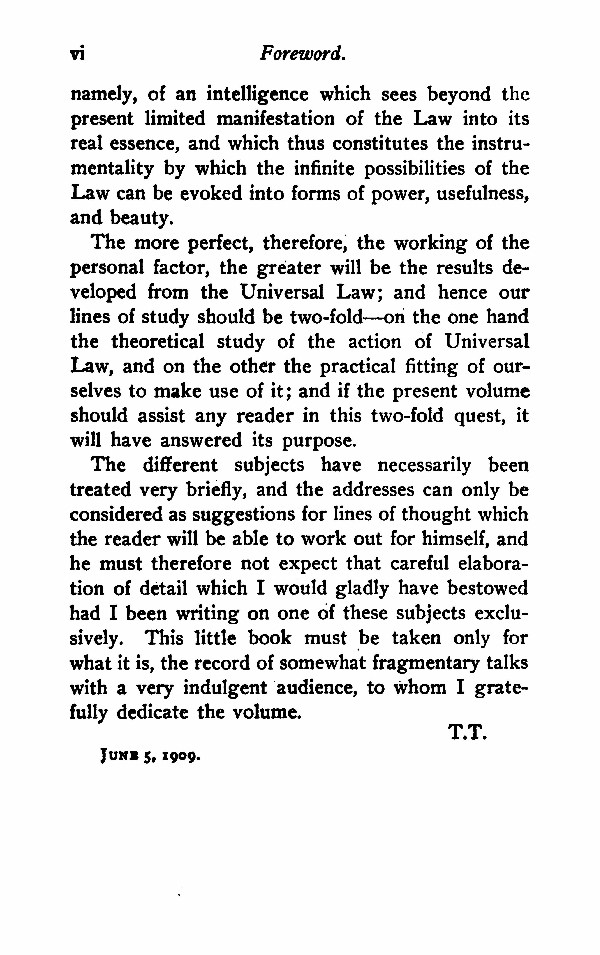 The more perfect, therefore, the working of the personal factor, the greater will be the results developed from the Universal Law; and hence our lines of study should be two-fold--on the one hand the theoretical study of the action of Universal Law, and on the other the practical fitting of ourselves to make use of it; and if the present volume should assist any reader in this two-fold quest, it will have answered its purpose.