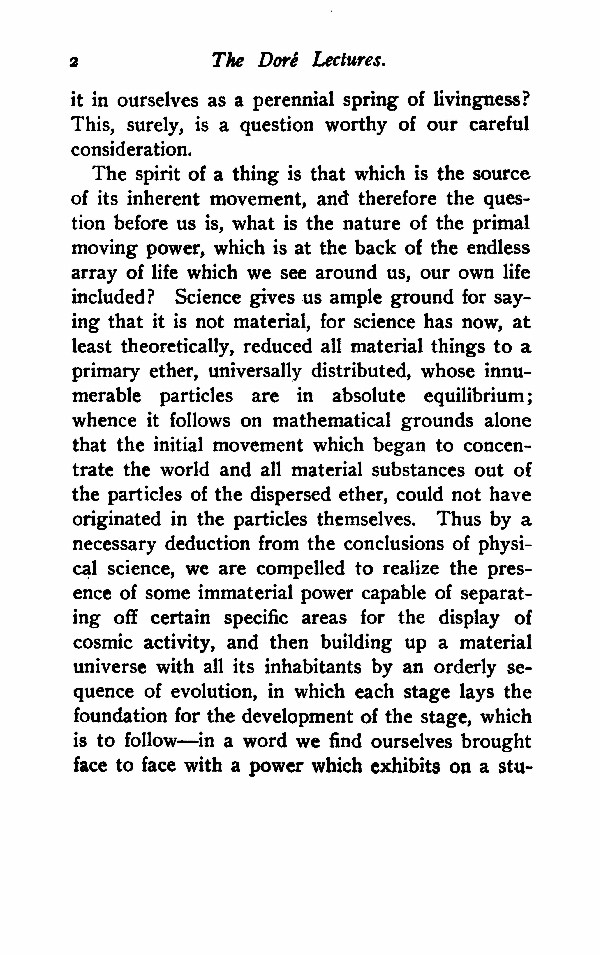 The spirit of a thing is that which is the source of its inherent movement, and therefore the question before us is, what is the nature of the primal moving power, which is at the back of the endless array of life which we see around us, our own life included? Science gives us ample ground for saying that it is not material, for science has now, at least theoretically, reduced all material things to a primary ether, universally distributed, whose innumerable particles are in absolute equilibrium; whence it follows on mathematical grounds alone that the initial movement which began to concentrate the world and all material substances out of the particles of the dispersed ether, could not have originated in the particles themselves. Thus by a necessary deduction from the conclusions of physical science, we are compelled to realize the presence of some immaterial power capable of separating off certain specific areas for the display of cosmic activity, and then building up a material universe with all its inhabitants by an orderly sequence of evolution, in which each stage lays the foundation for the development of the stage, which is to follow--in a word we find ourselves brought face to face with a power which exhibits on a