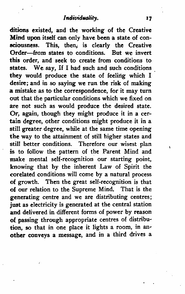 conditions existed, and the working of the Creative Mind upon itself can only have been a state of consciousness. This, then, is clearly the Creative Order--from states to conditions. But we invert this order, and seek to create from conditions to states. We say, If I had such and such conditions they would produce the state of feeling which I desire; and in so saying we run the risk of making a mistake as to the correspondence, for it may turn out that the particular conditions which we fixed on are not such as would produce the desired state. Or, again, though they might produce it in a certain degree, other conditions might produce it in a still greater degree, while at the same time opening the way to the attainment of still higher states and still better conditions. Therefore our wisest plan is to follow the pattern of the Parent Mind and make mental self-recognition our starting point, knowing that by the inherent Law of Spirit the correlated conditions will come by a natural process of growth. Then the great self-recognition is that of our relation to the Supreme Mind. That is the generating centre and we are distributing centres; just as electricity is generated at the central station and delivered in different forms of power by reason of passing through appropriate centres of distribution, so that in one place it lights a room, in another conveys a message, and in a third drives a