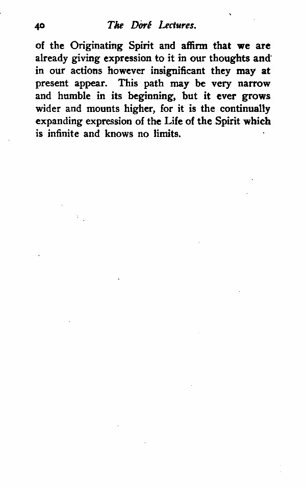 of the Originating Spirit and affirm that we are already giving expression to it in our thoughts and in our actions however insignificant that may at present appear. This path may be very narrow and humble in its beginning, but it ever grows wider and mounts higher, for it is continually expanding expression of the Life of the Spirit which is infinite and knows no limits.