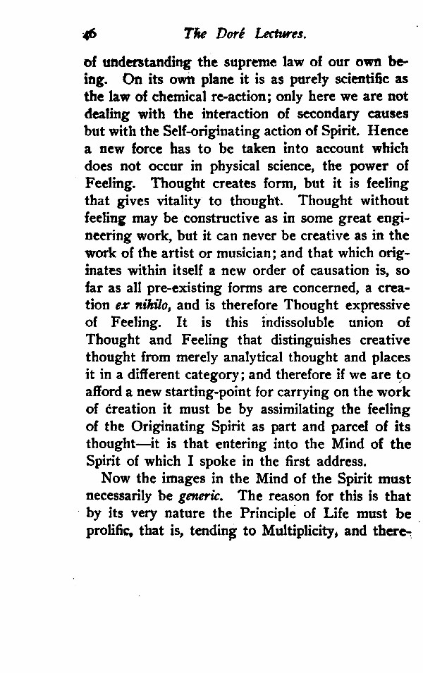 of understanding the supreme law of our own being. On its own plane it is as purely scientific as the law of chemical reaction; only here we are not dealing with the interaction of secondary causes but with the Self-originating action of Spirit. Hence a new force has to be taken into account which does not occur in physical science, the power of Feeling. Thought creates form, but it is feeling that gives vitality to thought. Thought without feeling may be constructive as in some great engineering work, but it can never be creative as in the work of the artist or musician; and that which originates within itself a new order of causation is, so far as all pre-existing forms are concerned, a creation ex nihilo, and is therefore Thought expressive of Feeling. It is this indissoluble union of Thought and Feeling that distinguishes creative thought from merely analytical thought and places it in a different category; and therefore if we are to afford a new starting-point for carrying on the work of creation it must be by assimilating the feeling of the Originating Spirit as part and parcel of its thought--it is that entering into the Mind of the Spirit of which I spoke in the first address.