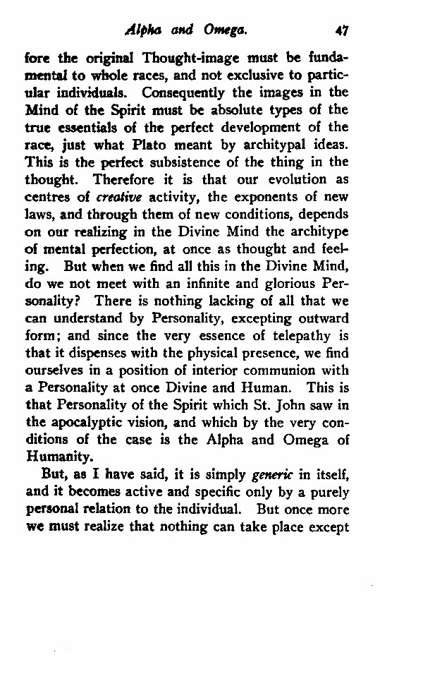 the original Thought-image must be fundamental to whole races, and not exclusive to particular individuals. Consequently the images in the Mind of the Spirit must be absolute types of the true essentials of the perfect development of the race, just what Plato meant by archetypal ideas. This is the perfect subsistence of the thing in the thought. Therefore it is that our evolution as centres of creative activity, the exponents of new laws, and through them of new conditions, depends on our realizing in the Divine Mind the archetype of mental perfection, at once as thought and feeling. But when we find all this in the Divine Mind, do we not meet with an infinite and glorious Personality? There is nothing lacking of all that we can understand by Personality, excepting outward form; and since the very essence of telepathy is that it dispenses with the physical presence, we find ourselves in a position of interior communion with a Personality at once Divine and Human. This is that Personality of the Spirit which St. John saw in the apocalyptic vision, and which by the very conditions of the case is the Alpha and Omega of Humanity.