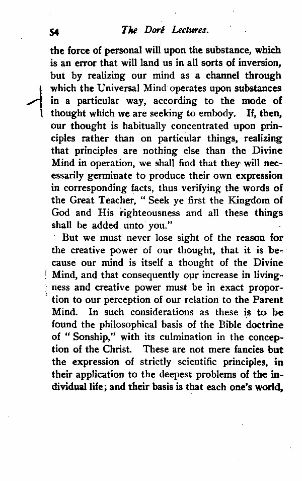 the force of personal will upon the substance, which is an error that will land us in all sorts of inversion, but by realizing our mind as a channel through which the Universal Mind operates upon substances in a particular way, according to the mode of thought which we are seeking to embody. If, then, our thought is habitually concentrated upon principles rather than on particular things, realizing that principles are nothing else than the Divine Mind in operation, we shall find that they will necessarily germinate to produce their own expression in corresponding facts, thus verifying the words of the Great Teacher, "Seek ye first the Kingdom of God and His righteousness and all these things shall be added unto you."
