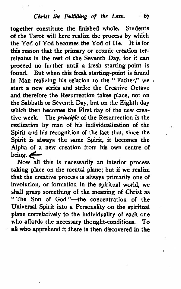 together constitute the finished whole. Students of the Tarot will here realize the process by which the Yod of Yod becomes the Yod of He. It is for this reason that the primary or cosmic creation terminates in the rest of the Seventh Day, for it can proceed no further until a fresh starting-point is found; But when this fresh starting-point is found in Man realizing his relation to the "Father," we start a new series and strike the Creative Octave and therefore the Resurrection takes place, not on the Sabbath or Seventh Day, but on the Eighth day which then becomes the First day of the new creative five week. The principle of the Resurrection is the realization by man of his individualization of the Spirit and his recognition of the fact that, since the Spirit is always the same Spirit, it becomes the Alpha of a new creation from his own centre of being.