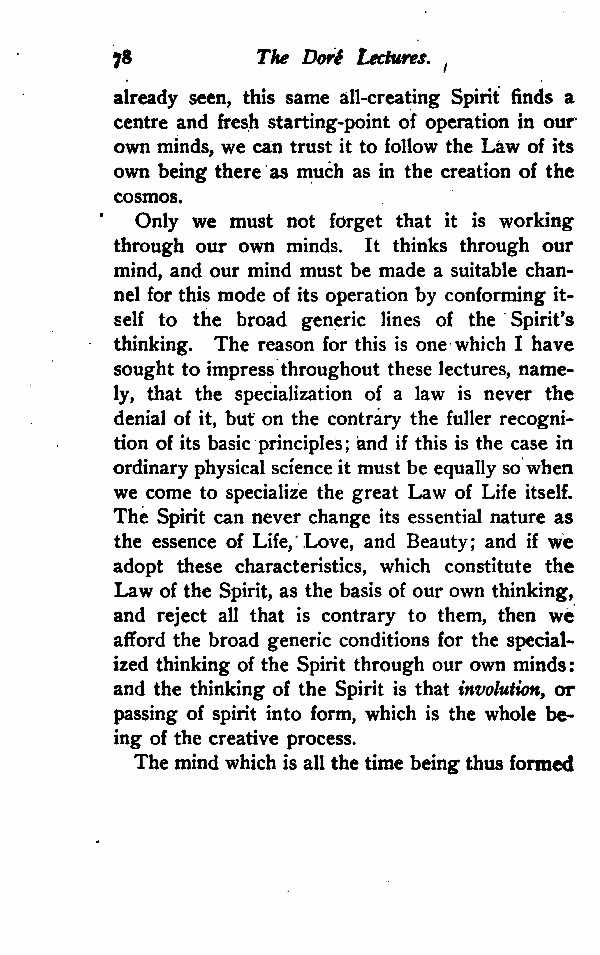 Only we must not forget that it is working through our own minds. It thinks through our mind, and our mind must be made a suitable channel for this mode of its operation by conforming itself to the broad generic lines of the Spirit's thinking. The reason for this is one which I have sought to impress throughout these lectures, namely, that the specialization of a law is never the denial of it, but on the contrary the fuller recognition of its basic principles; and if this is the case in ordinary physical science it must be equally so when we come to specialize the great Law of Life itself. The Spirit can never change its essential nature as the essence of Life, Love, and Beauty; and if we adopt these characteristics, which constitute the Law of the Spirit, as the basis of our own thinking, and reject all that is contrary to them, then we afford the broad generic conditions for the specialized thinking of the Spirit through our own minds: and the thinking of the Spirit is that involution, or passing of spirit into form, which is the whole being of the creative process.