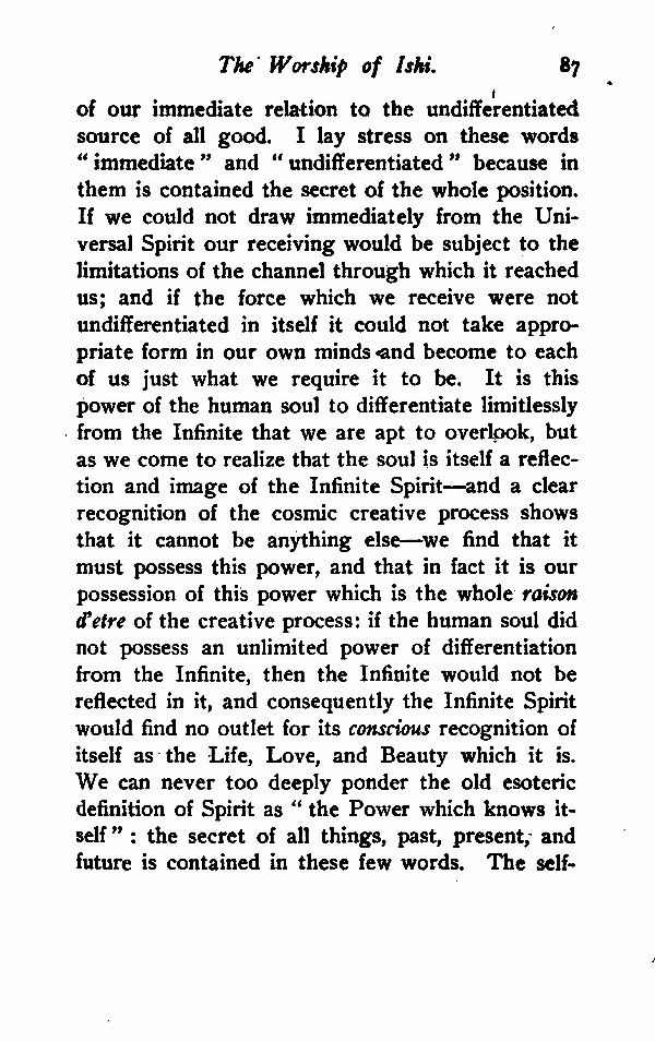 of our immediate relation to the undifferentiated source of all good. I lay stress on these words "immediate" and "undifferentiated" because in them is contained the secret of the whole position. If we could not draw immediately from the Universal Spirit our receiving would be subject to the limitations of the channel through which it reached us; and if the force which we receive were not undifferentiated in itself it could not take appropriate form in our own minds and become to each of us just what we require it to be. It is this power of the human soul to differentiate limitlessly from the Infinite that we are apt to overlook, but as we come to realize that the soul is itself a reflection and image of the Infinite Spirit--and a clear recognition of the cosmic creative process shows that it cannot be anything else--we find that it must possess this power, and that-in fact it is our possession of this power which is the whole raison d'etre of the creative process: if the human soul did not possess an unlimited power of differentiation from the Infinite, then the Infinite would not be reflected in it, and consequently the Infinite Spirit would find no outlet for its conscious recognition of itself as the Life, Love, and Beauty which it is. We can never too deeply ponder the old esoteric definition of Spirit as "the Power which knows itself": the secret of all things, past, present, and future is contained in these few words. The