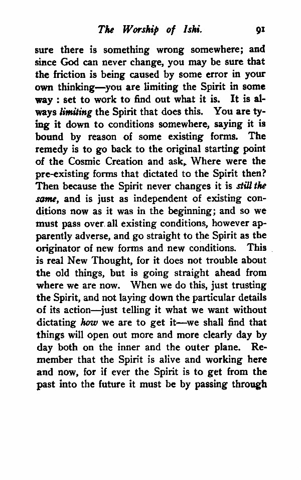 sure there is something wrong somewhere; and since God can never change, you may be sure that the friction is being caused by some error in your own thinking--you are limiting the Spirit in some way: set to work to find out what it is. It is always limiting the Spirit that does this. You are tying it down to conditions somewhere, saying it is bound by reason of some existing forms. The remedy is to go back to the original starting point of the Cosmic Creation and ask, Where were the pre-existing forms that dictated to the Spirit then? Then because the Spirit never changes it is still the same, and is just as independent of existing conditions now as it was in the beginning; and so we must pass over all existing conditions, however apparently adverse, and go straight to the Spirit as the originator of new forms and new conditions. This is real New Thought, for it does not trouble about the old things, but is going straight ahead from where we are now. When we do this, just trusting the Spirit, and not laying down the particular details of its action--just telling it what we want without dictating how we are to get it-- we shall find that things will open out more and more clearly day by day both on the inner and the outer plane. Remember that the Spirit is alive and working here and now, for if ever the Spirit is to get from the past into the future it must be by passing through