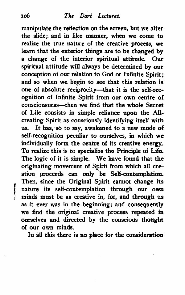 manipulate the reflection on the screen, but we alter the slide; and in like manner, when we come to realize the true nature of the creative process, we learn that the exterior things are to be changed by a change of the interior spiritual attitude. Our spiritual attitude will always be determined by our conception of our relation to God or Infinite Spirit; and so when we begin to see that this relation is one of absolute reciprocity--that it is the self-recognition of Infinite Spirit from our own centre of consciousness--then we find that the whole Secret of Life consists in simple reliance upon the All creating Spirit as consciously identifying itself with us. It has, so to say, awakened to a new mode of self-recognition peculiar to ourselves, in which we individually form the centre of its creative energy. To realize this is to specialize the Principle of Life. The logic of it is simple. We have found that the originating movement of Spirit from which all creation proceeds can only be Self-contemplation. Then, since the Original Spirit cannot change its nature its self-contemplation through our own minds must be as creative in, for, and through us as it ever was in the beginning; and consequently we find the original creative process repeated in ourselves and directed by the conscious thought of our own minds.