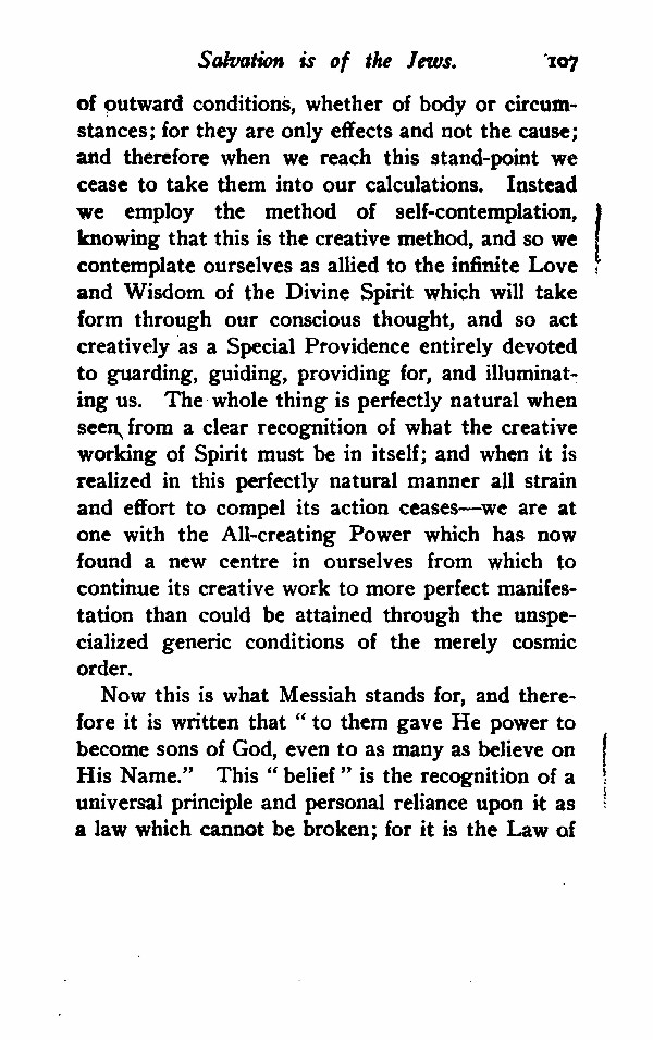 of outward conditions, whether of body or circumstances; for they are only effects and not the cause; and therefore when we reach this stand-point we cease to take them into our calculations. Instead we employ the method of self-contemplation knowing that this is the creative method, and so we contemplate ourselves as allied to the infinite Love and Wisdom of the Divine Spirit which will take form through our conscious thought, and so act creatively as a Special Providence entirely devoted to guarding, guiding, providing for, and illuminating us. The whole thing is perfectly natural when seen from a clear recognition of what the creative working of Spirit must be in itself; and when it is realized in this perfectly natural manner all strain and effort to compel its action ceases--we are at one with the All-creating Power which has now found a new centre in ourselves from which to continue its creative work to more perfect manifestation than could be attained through the unspecialized generic conditions of the merely cosmic order.