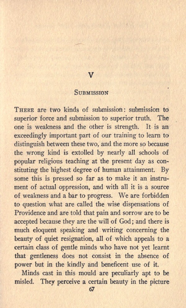 THERE are two kinds of submission: submission to superior force and submission to superior truth. The one is weakness and the other is strength. It is an exceedingly important part of our training to learn to distinguish between these two, and the more so because the wrong kind is extolled by nearly all schools of popular religious teaching at the present day as constituting the highest degree of human attainment. By some this is pressed so far as to make it an instrument of actual oppression, and with all it is a source of weakness and a bar to progress. We are forbidden to question what are called the wise dispensations of Providence and are told that pain and sorrow are to be accepted because they are the will of God; and there is much eloquent speaking and writing concerning the beauty of quiet resignation, all of which appeals to a certain class of gentle minds who have not yet learnt that gentleness does not consist in the absence of power but in the kindly and beneficent use of it.