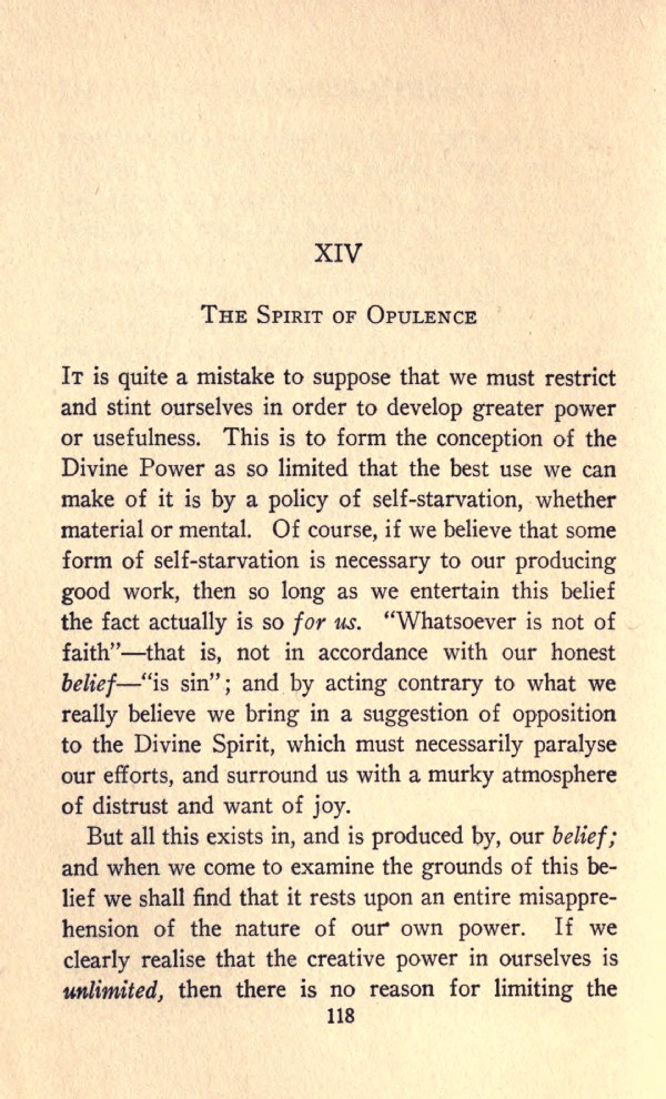 It is quite a mistake to suppose that we must restrict and stint ourselves in order to develop greater power or usefulness. This is to form the conception of the Divine Power as so limited that the best use we can make of it is by a policy of self-starvation, whether material or mental. Of course, if we believe that some form of self-starvation is necessary to our producing good work, then so long as we entertain this belief the fact actually is so for us. "Whatsoever is not of faith"--that is, not in accordance with our honest belief--"is sin"; and by acting contrary to what we really believe we bring in a suggestion of opposition to the Divine Spirit, which must necessarily paralyse our efforts, and surround us with a murky atmosphere of distrust and want of joy.
