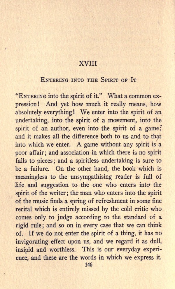 "Entering into the spirit of it." What a common expression! And yet how much it really means, how absolutely everything! We enter into the spirit of an undertaking, into the spirit of a movement, into the spirit of an author, even into the spirit of a game; and it makes all the difference both to us and to that into which we enter. A game without any spirit is a poor affair; and association in which there is no spirit falls to pieces; and a spiritless undertaking is sure to be a failure. On the other hand, the book which is meaningless to the unsympathising reader is full of life and suggestion to the one who enters into, the spirit of the writer; the man who enters into the spirit of the music finds a spring of refreshment in some fine recital which is entirely missed by the cold critic who comes only to judge according to the standard of a rigid rule; and so on in every case that we can think of. If we do not enter the spirit of a thing, it has no invigorating effect upon us, and we regard it as dull, insipid and worthless. This is our everyday experience, and these are the words in which we express it.