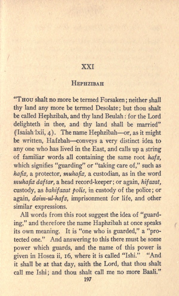 "Thou shalt no more be termed Forsaken; neither shall thy land any more be termed Desolate; but thou shalt be called Hephzibah, and thy land Beulah: for the Lord delighteth in thee, and thy land shall be married" (Isaiah lxii, 4). The name Hephzibah--or, as it might be written, Hafzbah--conveys a very distinct idea to any one who has lived in the East, and calls up a string of familiar words all containing the same root hafz, which signifies "guarding" or "taking care of," such as hafiz, a protector, muhafiz, a custodian, as in the word muhafiz daftar, a head record-keeper; or again, hifazat, custody, as bahifazat polis, in custody of the police; or again, daim-ul-hafz, imprisonment for life, and other similar expressions.