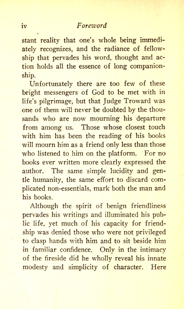 Unfortunately there are too few of these bright messengers of God to be met with in life's pilgrimage, but that Judge Thomas Troward was one of them will never be doubted by the thousands who are now mourning his departure from among us. Those whose closest touch with him has been the reading of his books will mourn him as a friend only less than those who listened to him on the platform. For no books ever written more clearly expressed the author. The same simple lucidity and gentle humanity, the same effort to discard complicated non-essentials, mark both the man and his books.