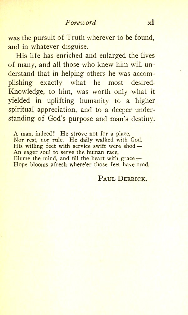 His life has enriched and enlarged the lives of many, and all those who knew him will understand that in helping others he was accomplishing exactly what he most desired. Knowledge, to him, was worth only what it yielded in uplifting humanity to a higher spiritual appreciation, and to a deeper understanding of God's purpose and man's destiny.