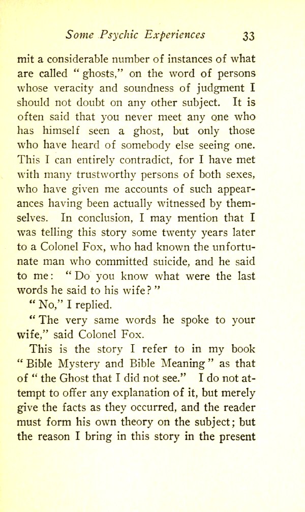 This is the story I refer to in Chapter 12 of my book Bible Mystery and Bible Meaning as that of "the Ghost that I did not see". I do not attempt to offer any explanation of it but merely give the facts as they occurred, and the reader must form his own theory on the subject; but the reason I bring in this story in the present