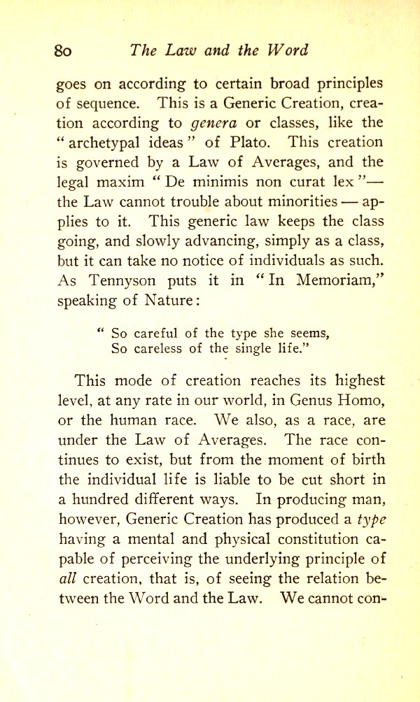 This mode of creation reaches its highest level, at any rate in our world, in Genus Homo --- the human race. We also, as a race, are under the Law of Averages. The race continues to exist, but from the moment of birth the individual life is liable to be cut short in a hundred different ways. In producing man, however, Generic Creation has produced a type having a mental and physical constitution capable of perceiving the underlying principle of all creation --- that is, of seeing the relation between the Word and the Law.