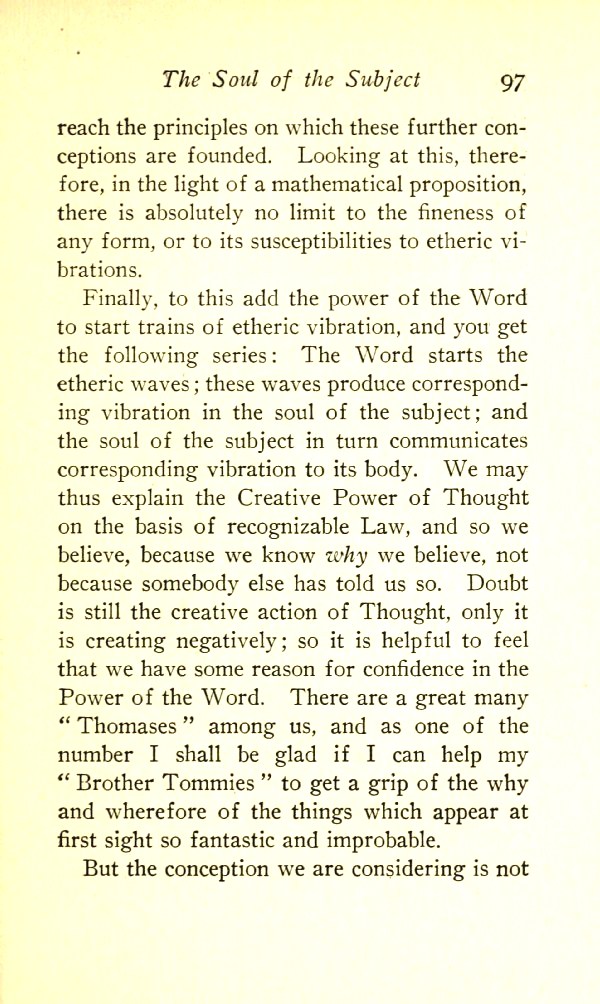 Finally, to this add the power of the Word to start trains of etheric vibration, and you get the following series: The Word starts the etheric waves; these waves produce corresponding vibration in the soul of the subject; and the soul of the subject in turn communicates corresponding vibration to its body. We may thus explain the Creative Power of Thought on the basis of recognisable Law --- and so we believe because we know why we believe; not because somebody has told us so. Doubt is still the creative action of Thought, only it is creating negatively; so it is helpful to feel that we have some reason for confidence in the Power of the Word. There are a great many "doubting Thomases" among us and, as one of the number, I shall be glad if I can help my "Brother Tommies" to get a grip of the why and wherefore of the things which appear at first sight so fantastic and improbable.