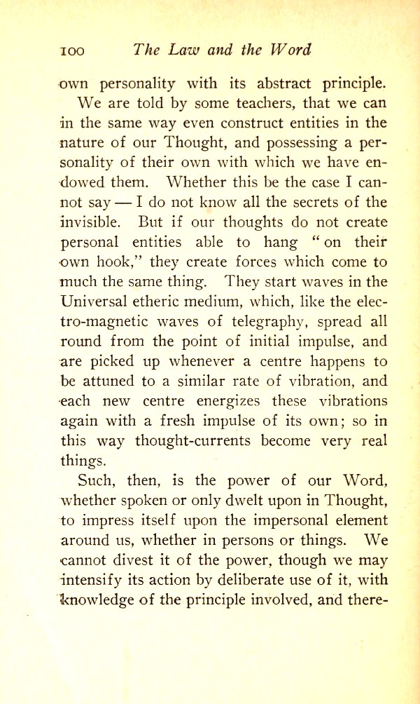 We are told by some teachers that we can in the same way construct entities in the nature of our Thought and possessing a personality of their own with which we have endowed them. Whether this be the case I cannot say --- I do not know all the secrets of the invisible. But if our thoughts do not create personal entities able to "hang on their own hook", they create forces which come to much the same thing. They start waves in the Universal etheric medium which, like the electromagnetic waves of telegraphy, spread all round from the point of initial impulse and are picked up whenever a centre happens to be attuned to a similar rate of vibration, and each new centre energises these vibrations again with a fresh impulse of its own; so in this way thought currents become very real things. Such, then, is the power of our Word, whether spoken or only dwelt upon in Thought, to impress itself upon the impersonal element around us, whether in persons or things. We cannot divest it of the power, though we may intensify its action by deliberate use of it with knowledge of the principle involved; and therefore,