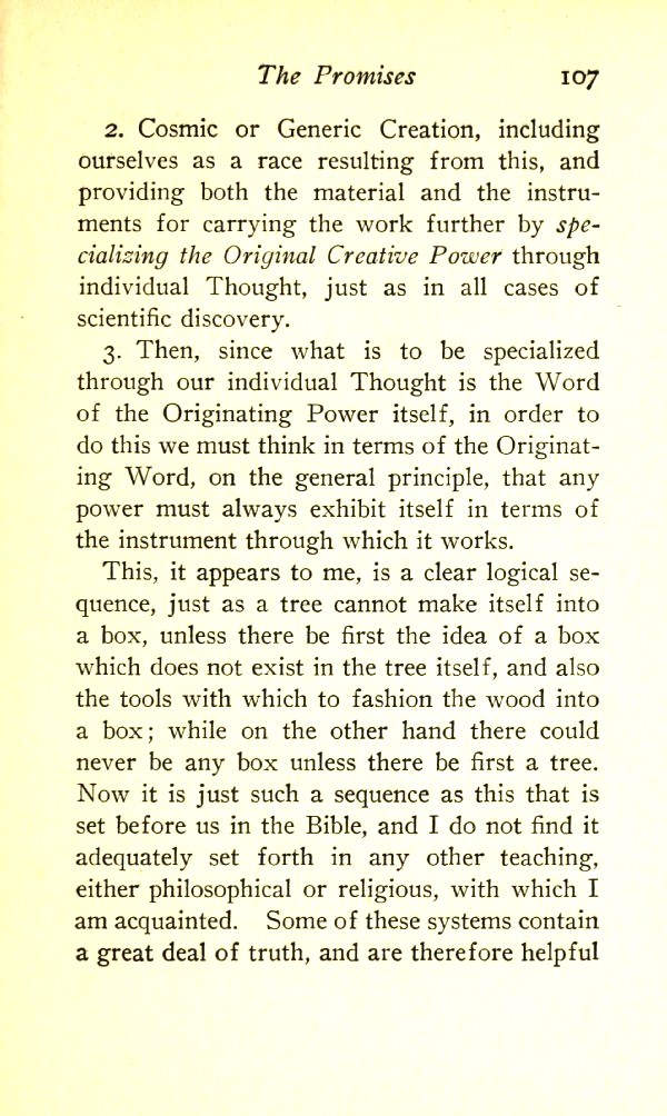 This, it appears to me, is a clear, logical sequence, just as a tree cannot make itself into a box unless there first be the idea of a box which does not exist in the tree itself, and also the tools with which to fashion the wood into a box; while on the other hand there could never be any such box unless there were first a tree. Now it is just such a sequence that is set before us in the Bible, and I do not find it adequately set forth in any other teaching, either philosophical or religious, with which I am acquainted. Some of these systems contain a great deal of truth and are therefore