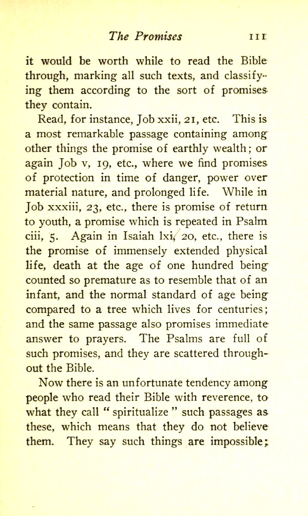 Read, for instance, Job 22:21, etc. This is a most remarkable passage, containing among other things the promise of earthly wealth; or again Job 5:19, etc., where we find promises of protection in time of danger, power over material nature, and prolonged life. While in Job 33:23, etc., there is promise of return to youth, a promise which is repeated in Psalm 103:5. Again in Isaiah 65:20, etc., there is the promise of immensely extended physical life, death at the age of one hundred being counted so premature as to resemble that of an infant, and the normal standard of age being compared to a a tree which lives for centuries; and the same passage also promises immediate answer to prayers. The Psalms are full of such promises, and they are scattered throughout the Bible.