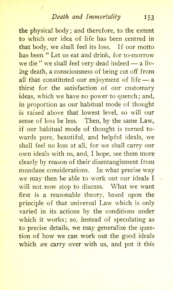 the physical body; and therefore to the extent to which our idea of life has been centred in that body, we shall feel its loss. If our motto has been "Let us eat, drink, for tomorrow we die", we shall feel very dead indeed --- a living death, a consciousness of being cut off from all that constituted our enjoyment of life --- a thirst for the satisfaction of our customary ideas, which we have no power to quench; and, in proportion as our habitual mode of thought is raised above that lowest level, so will our sense of loss be less. Then, by the same Law, if our habitual mode of thought is turned towards pure, beautiful, and helpful ideals, we shall feel no loss at all, for we shall carry our own ideals with us and, I hope, see them more clearly by reason of their disentanglement from mundane considerations.