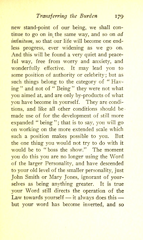 new standpoint of our being, we shall continue to go on in the same way, and so on ad infinitum, so that our life will become one endless progress, ever widening as we go on. And this will be found a very quiet and peaceful way, free from worry and anxiety, and wonderfully effective. It may lead you to some position of authority or celebrity; but as such things belong to the category of "Having" and not of "Being", they were not what you aimed at and are only by-products of what you have become in yourself. They are conditions, and like all other conditions should be made use of for the development of still more expanded "being"; that is to say, you will go on working on the more extended scale which such a position makes possible to you.