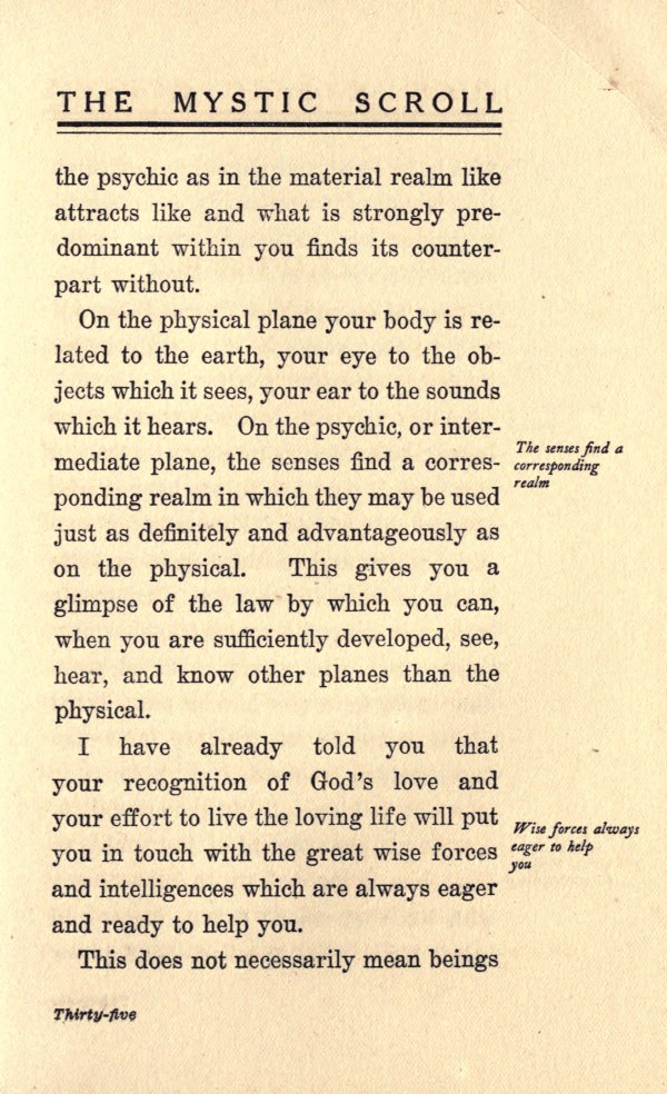 which it hears. On the psychic, or intermediate plane, the senses find a corresponding realm in which they may be used