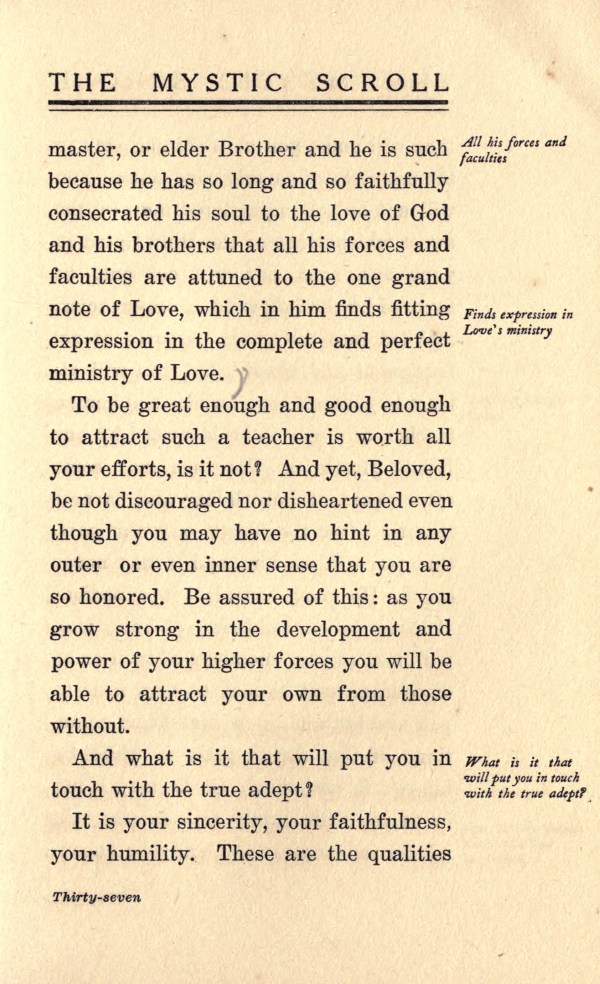 master, or elder Brother and he is such because he has so long and so faithfully consecrated his soul to the love of God and his brothers that all his forces and faculties are attuned to the one grand note of Love, which in him finds fitting expression m the complete and perfect ministry of Love.