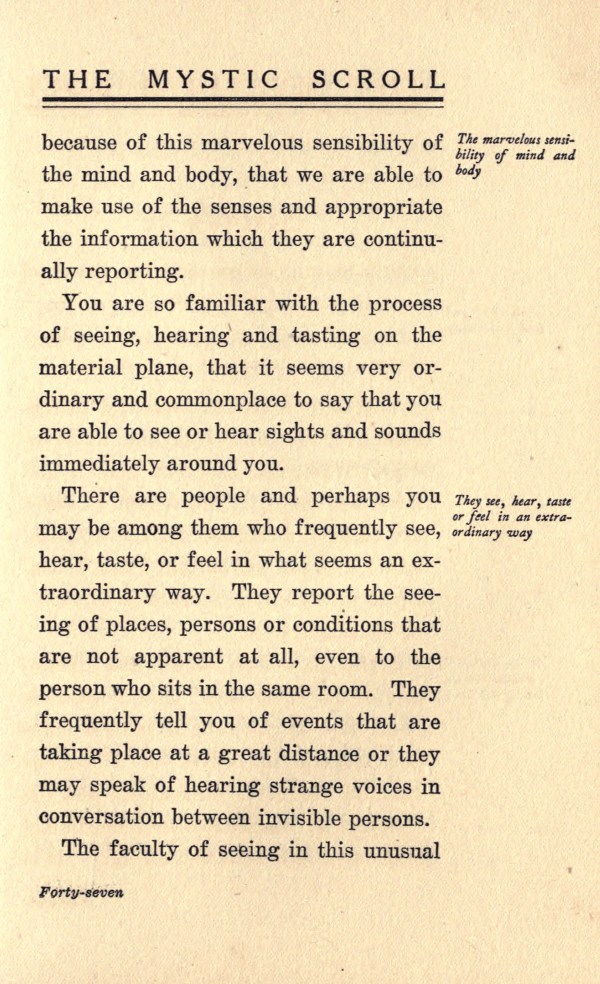 hear, taste, or feel in what seems an extraordinary way. They report the seeing of places, persons or conditions that