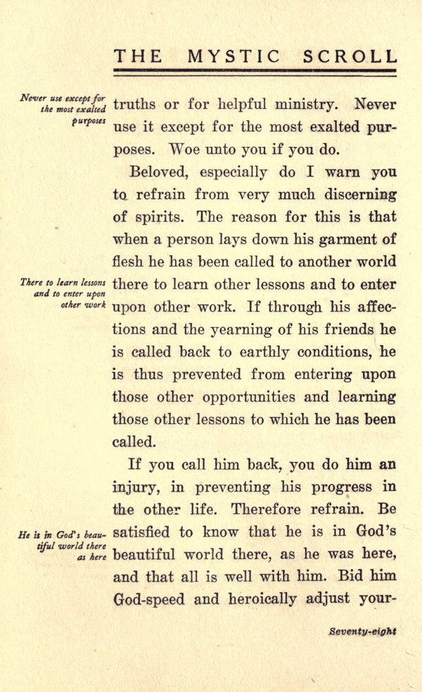 If you call him back, you do him an injury, in preventing his progress in the other life. Therefore refrain. Be satisfied to know that he is in God's beautiful world there, as he was here, and that all is well with him. Bid him God-speed and heroically adjust yourself