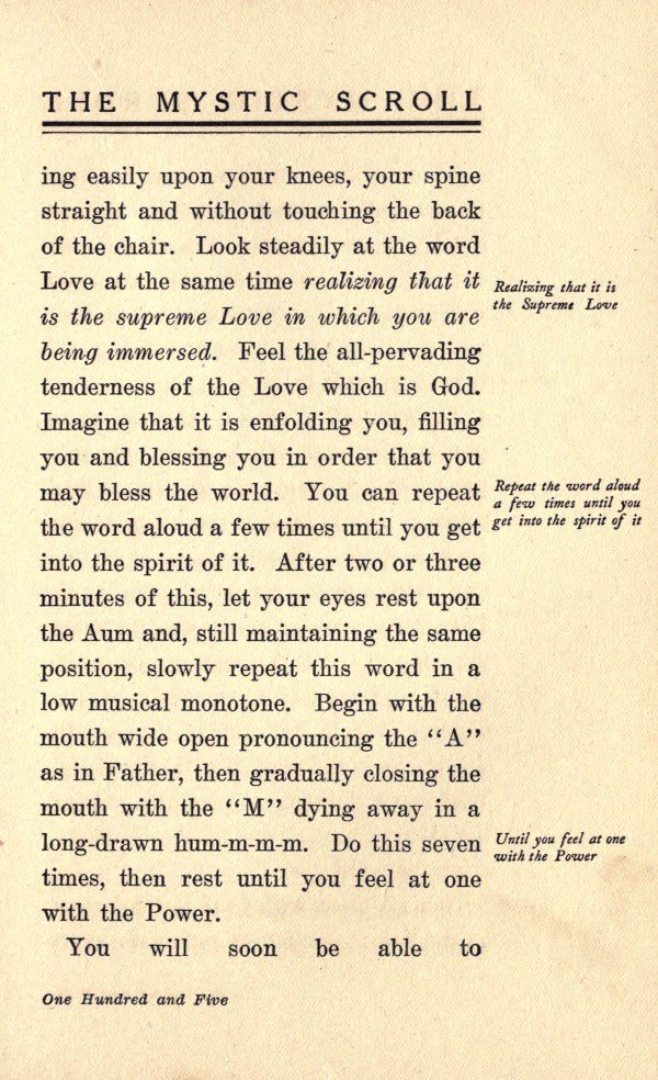 may bless the world. You can repeat the word aloud a few tunes until you get into the spirit of it. After two or three minutes of this, let your eyes rest upon the Aum and, still maintaining the same position, slowly repeat this word in a low musical monotone. Begin with the mouth wide open pronouncing the "A" as in Father, then gradually closing the mouth with the "M" dying away in a long-drawn hum-m-m-m.