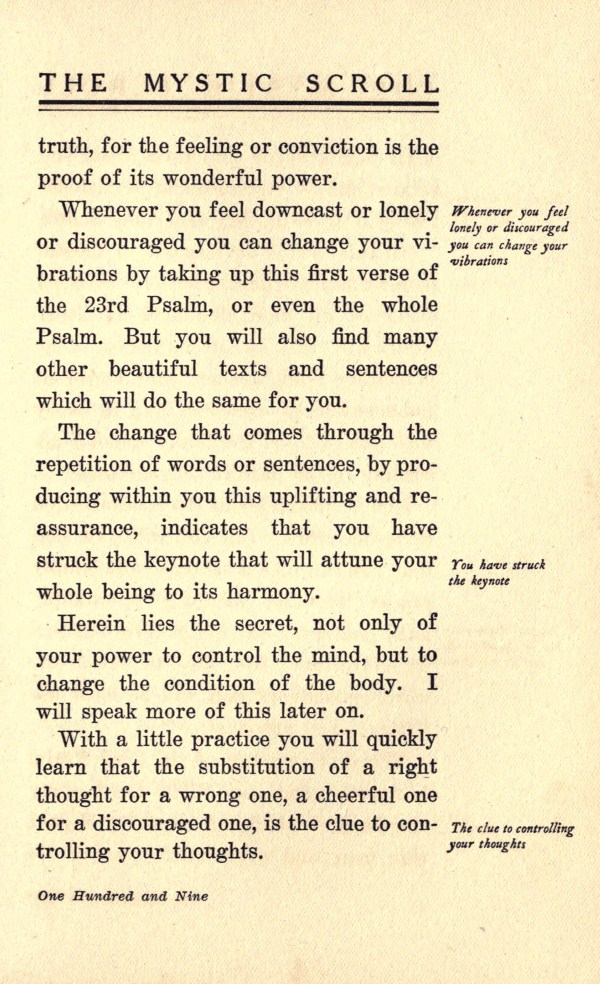 Whenever you feel downcast or lonely you can change your vibrations by taking up this first verse of the 23rd Psalm, or even the whole Psalm. But you will also find many other beautiful texts and sentences which will do the same for you.