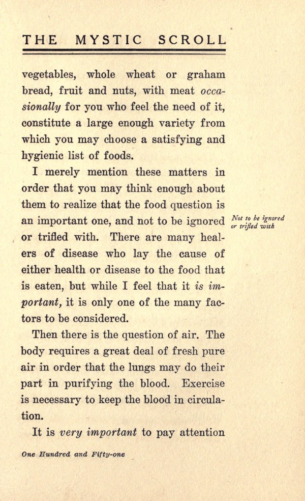 bread, fruit and nuts, with meat occasionally for you who feel the need of it,