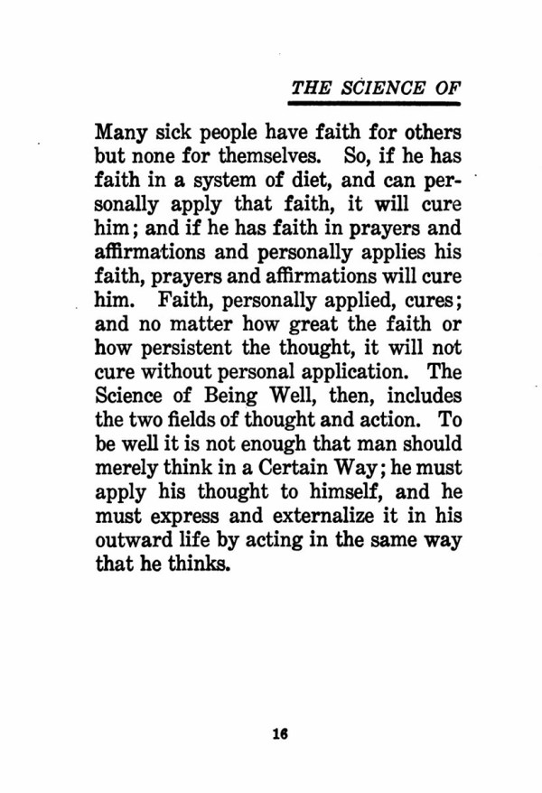Many sick people have faith for others but none for themselves. So, if he has faith in a system of diet, and can personally apply that faith, it will cure him; and if he has faith in prayers and affirmations and personally applies his faith, prayers and affirmations will cure him. Faith, personally applied, cures; and no matter how great the faith or how persistent the thought, it will not cure without personal application. The Science of Being Well, then, includes the two fields of thought and action. To be well it is not enough that man should merely think in a Certain Way; he must apply his thought to himself, and he must express and externalize it in his outward life by acting in the same way that he thinks.