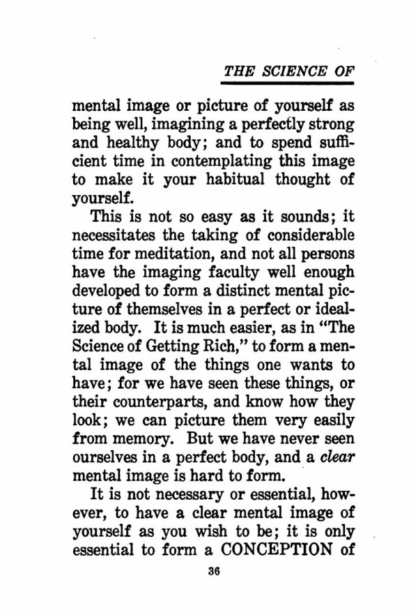 This is not so easy as it sounds; it necessitates the taking of considerable time for meditation, and not all persons have the imaging faculty well enough developed to form a distinct mental picture of themselves in a perfect or idealized body. It is much easier, as in "The Science of Getting Rich," to form a mental image of the things one wants to have; for we have seen these things, or their counterparts, and know how they look; we can picture them very easily from memory. But we have never seen ourselves in a perfect body, and a clear mental image is hard to form.