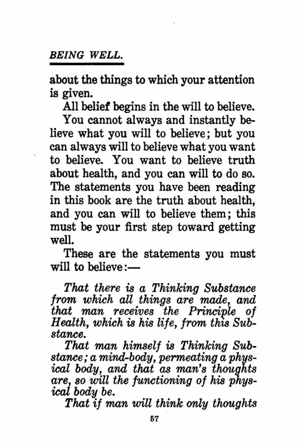 All belief begins in the will to believe. You cannot always and instantly believe what you will to believe but you can always will to believe what you want to believe. You want to believe truth about health, and you can will to do so. The statements you have been reading in this book are the truth about health, and you can will to believe them; this must be your first step toward getting well.