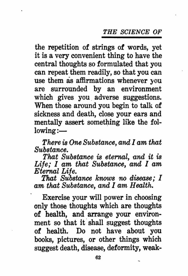 the repetition of strings of words, yet it is a very convenient thing to have the central thoughts so formulated that you can repeat them readily, so that you can use them is affirmations whenever you are surrounded by an environment which gives you adverse suggestions. When those around you begin to talk of sickness and death, close your ears and mentally assert something like the following: ---