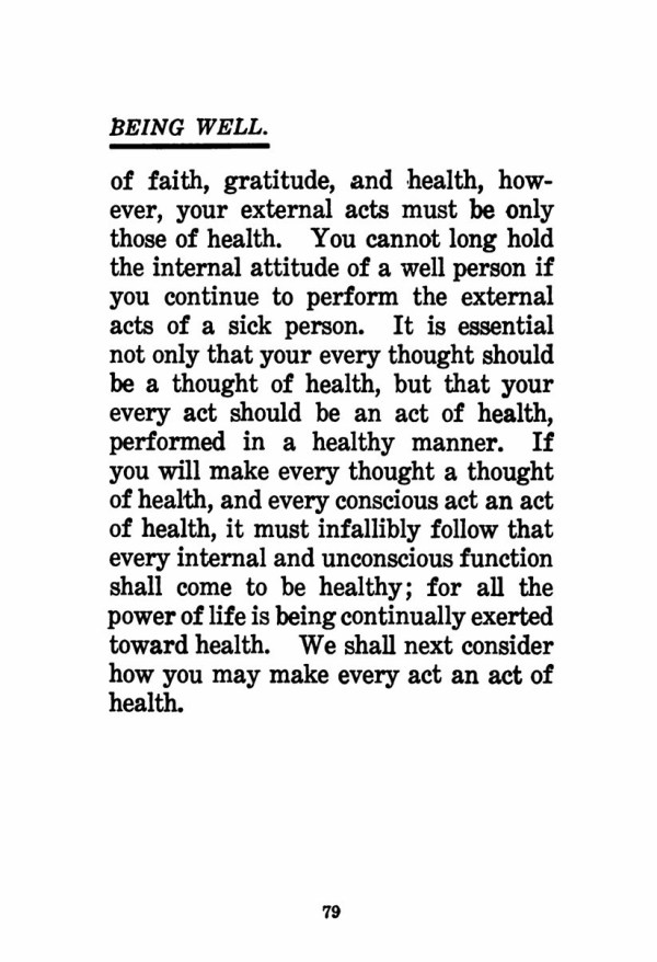 of faith, gratitude, and health, however, your external acts must be only those of health. You cannot long hold the internal attitude of a well person if you continue to perform the external acts of a sick person. It is essential not only that your every thought should be a thought of health, but that your every act should be an act of health, performed in a healthy manner. If you will make every thought a thought of health, and every conscious act an act of health, it must infallibly follow that every internal and unconscious function shall come to be healthy; for all the power of life is being continually exerted toward health. We shall next consider how you may make every act an act of health.