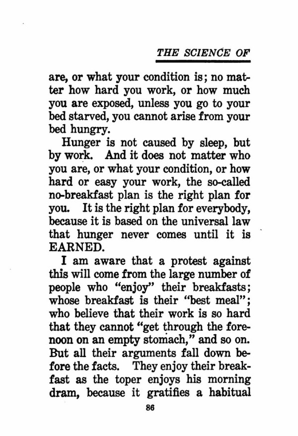 Hunger is not caused by sleep, but by work. And it does not matter who you are, or what your condition, or how hard or easy your work, the so-called no-breakfast plan is the right plan for you. It is the right plan for everybody, because it is based on the universal law that hunger never comes until it is EARNED.
