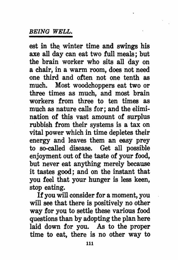 in the winter time and swings his axe all day can eat two full meals; but the brain worker who sits all day on a chair, in a warm room, does not need one third and often not one tenth as much. Most woodchoppers eat two or three times as much, and most brain workers from three to ten times as much as nature calls for; and the elimination of this vast amount of surplus rubbish from their systems is a tax on vital power which in time depletes their energy and leaves them an easy prey to so-called disease. Get all possible enjoyment out of the taste of your food, but never eat anything merely because it tastes good; and on the instant that you feel that your hunger is less keen, stop eating.